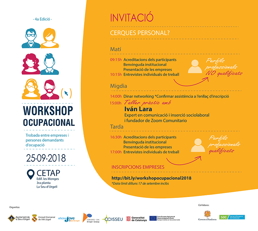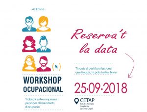 El proper dimarts 25 de setembre de 2018 a partir de les 9:15h al Centre Empresarial i Tecnològic de l’Alt Pirineu i Aran (CETAP, Edifici les Monges, 3a planta), tindar lloc la 4a edició del Workshop ocupacional a la Seu d’Urgell.c
