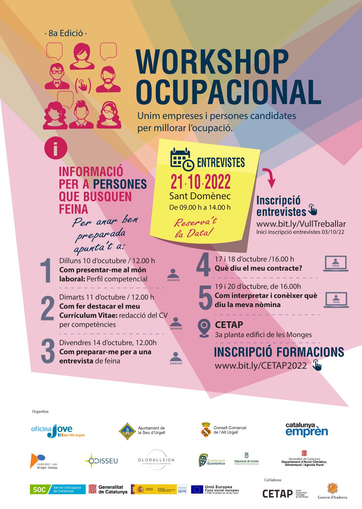 El divendres 21 d’octubre la Seu d’Urgell acollirà la vuitena edició del Workshop Ocupacional. La trobada entre empreses i persones demandants d’ocupació tindrà lloc a partir de dos quarts de deu del matí i fins les dues del migdia, enguany a la sala Sant Domènec. A les nou del matí es farà una rebuda i presentació oficial de l’esdeveniment, i a partir d’aquí, des dos quarts de deu del matí a dues del migdia es realitzaran les entrevistes individuals entre les empreses i les persones demandants d’ocupació.
