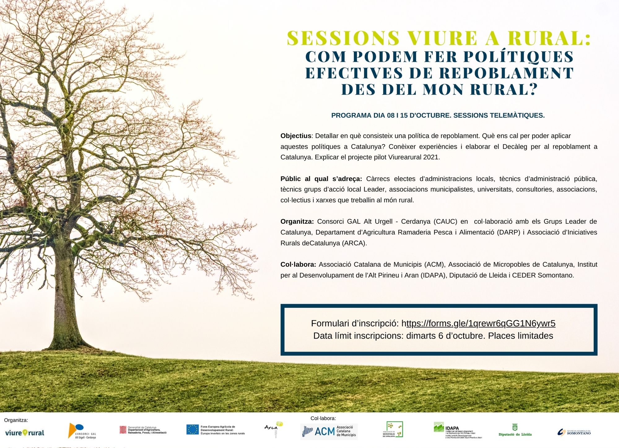 El proper dia 8 i 15 d’octubre tindran lloc les primeres jornades telemàtiques de Viure a Rural on es parlarà sobre com podem fer polítiques efectives de repoblament des del món rural. Aquestes jornades estan adreçades a càrrecs electes d’administracions locals, tècnics d’administració pública, tècnics grups d’acció local Leader, associacions municipalistes, universitats, consultories associacions, col·lectius o xarxes que treballin al món rural. Entre tots els implicats es buscarà detallar en què consisteixen les polítiques de repoblament i quines són les eines necessàries per poder-les aplicar als territoris rurals de Catalunya.