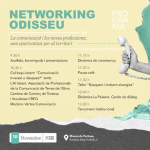 En aquesta ocasió, i com continuació del networking de l’any passat, s’aprofundeix en l’àmbit de la comunicació, les noves professions i com aquestes poden ajudar a la millora i progrés del teixit empresarial i cooperatiu d’aquestes terres. Vegeu-ne el programa amb xerrades, taules rodones i dinàmiques per afavorir aquesta coneixença i treballar conjuntament amb reptes, solucions i recerca de feina.