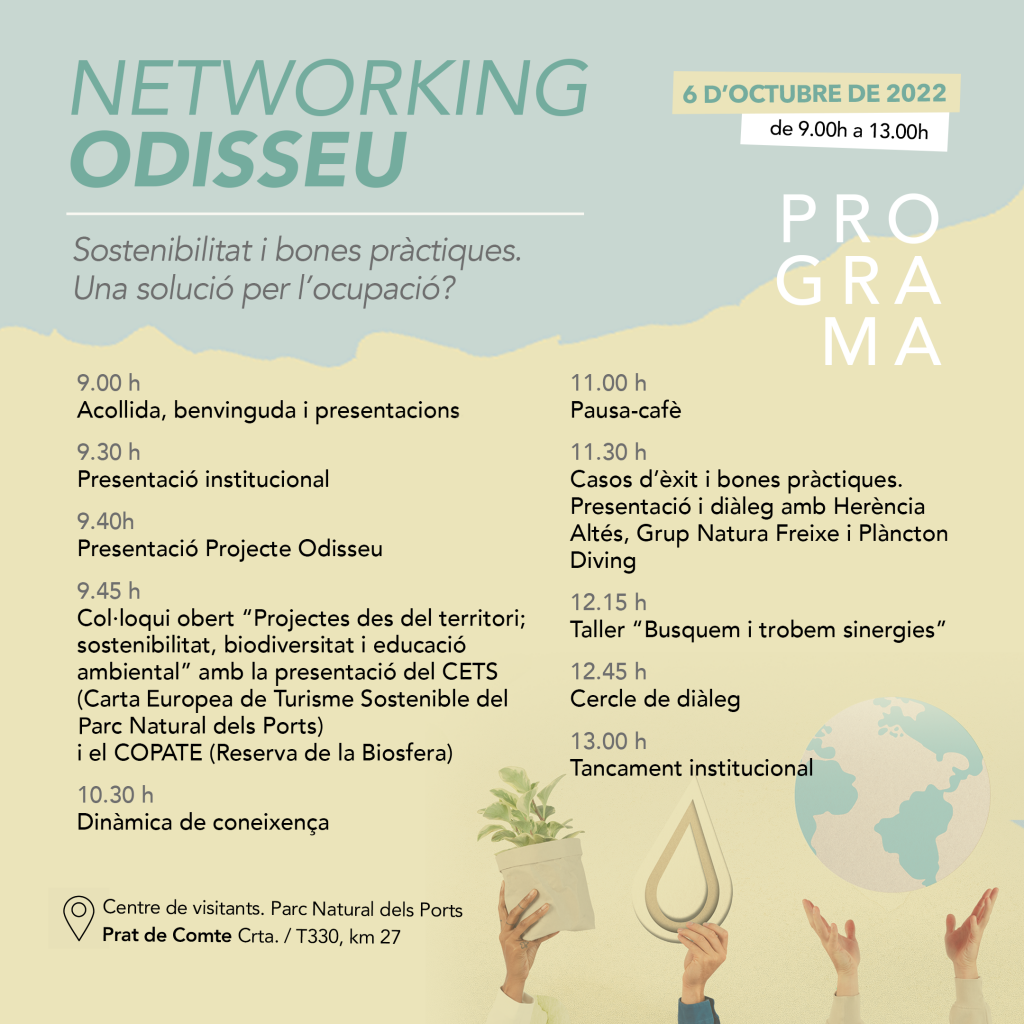 L’Oficina Jove de la Terra Alta, juntament amb la Coordinació Territorial de Joventut, l’Ateneu Cooperatiu Terres de l’Ebre i el Consorci d’Iniciatives Socioeconòmiques, organitzem el Networking Odisseu: Sostenibilitat i bones pràctiques. Una solució per l’ocupació? que tindrà lloc el proper dia 6 d’octubre al Centre de visitants del Parc Natural dels Ports a Prat de Comte.